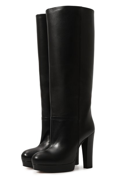 Для создания черных сапог с прямым широким голенищем мастера марки использовали пластичную мелкозернистую кожу, отшлифованную до легкого блеска. Материал раскроили так, чтоб ы на готовой паре получились швы, визуально акцентирующие внимание на изящном подъеме. Высоту устойчивого каблука немного компенсировали широкой платформой.