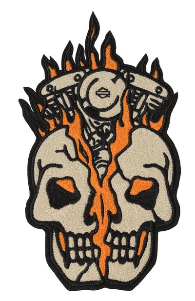 Фигурную нашивку в виде расколотого пополам черепа в языках пламени вышили прочными легкими нитями оранжевого, белого и черного цветов. Контуры аксессуара подчеркнули узким кантом. Такое изделие с клеевой задней поверхностью будет органично смотреться как на косухе, так и на шляпе или сумке.