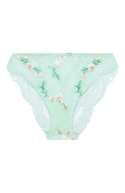 Для изготовления зеленых слипов мастера бренда использовали эластичный материал с разной фактурой: ажурное кружево и тонкий сетчатый тюль. Спереди трусы украсили цветочной вышивкой, созданной по мотивам картины Моне «Кувшинки», а сзади — миниатюрным атласным бантом.