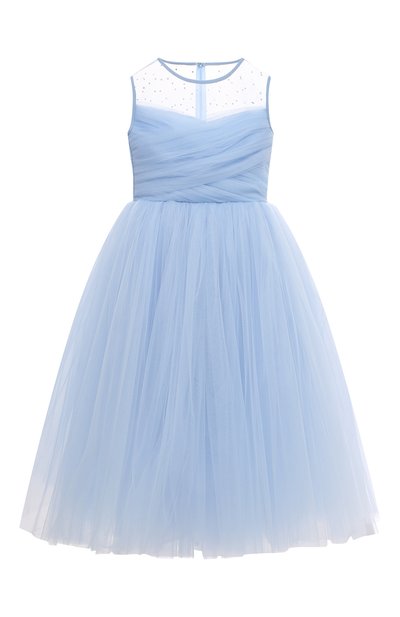 С этим платьем малышка сможет примерить на себя образ сказочной принцессы на балу. Атмосферу волшебства создадут приталенный крой с пышным подолом и легкие складки на пастельно-голубом тюле. Впечатление усилят искрящиеся, словно пыльца фей, стразы на прозрачных плечах и гипертрофированный серебристый бант сзади на талии.