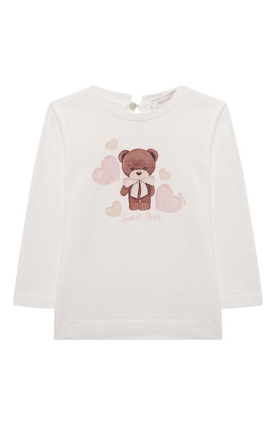 Белый лонгслив с круглым вырезом сшит из приятного на ощупь хлопкового трикотажа. Гладкий эластичный материал отлично пропускает воздух и не вызывает аллергию, а крой не сковывает движения. Модель, застегивающаяся на пуговицу, украшена спереди крупным принтом.