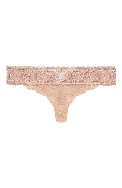 Для пошива стрингов дизайнеры марки выбрали два вида нежного полупрозрачного кружева с романтичными цветочными узорами. Швы проработали максимально тщательно, поэтому модель с заниженной посадкой почти не ощущается на теле. Сзади расположили композицию из узких атласных лент и крупного золотистого кольца.
