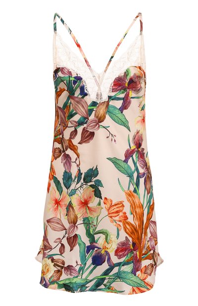 Для пошива бежевой сорочки из капсульной коллекции Sweet Folk мастера марки использовали мягкий струящийся креп с крупным цветочным принтом. В состав материала добавили стрейчевые волокна, поэтому модель немного тянется, но не деформируется после стирок. Изделие с тонкими, перекрещивающимися на открытой спине бретелями декорировали белым кружевом на лифе.