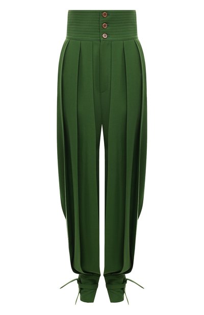 При создании зеленых джоггеров команда бренда, основанного Гуччио Гуччи, тщательно поработала над кроем. Брючины выполнили так, чтобы они были подчеркнуто объемными, усилив эффект крупными графичными складками. Узкие длинные манжеты дополнили лентами, а пояс сделали более широким, чем обычно, сделав так акцент на талии. Для по шива модели выбрали мягкую гладкую шерсть.