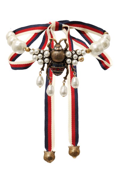 Для изготовления разноцветного регулируемого колье мастера марки использовали мягкий прочный текстиль в оттенках ленты Sylvie Web. Центральный элемент в форме знаковой для бренда пчелы выполнили из ювелирного сплава с чернением. Внимание на детали акцентировали перламутровыми бусинами ра зного размера. По краям аксессуара разместили подвески в виде головы пантеры.
