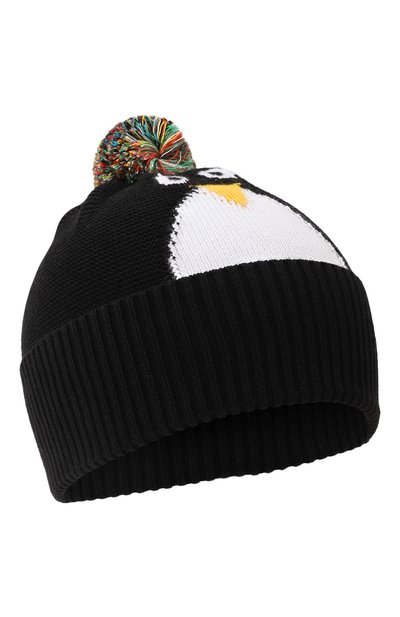 Черная шапка бини с широким отворотом и рельефными узорами украшена небольшим разноцветным помпоном и изображением пингвина. Эластичный аксессуар из мягкой пряжи на основе органического хлопка отлично держит тепло, не электризует волосы и не растягивается со временем.
