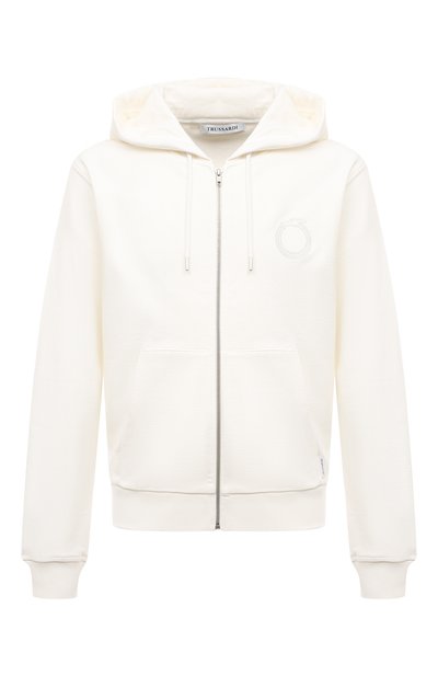 Мастера марки выполнили белую толстовку из мягкого хлопкового трикотажа. Материал с фактурной изнанкой пропускает воздух и при этом сохраняет тепло при незначительном снижении температуры, поэтому модель может стать альтернативой ветровке. Изделие украсили спереди небольшой эмблемой бренда, выш итой нитями в тон.