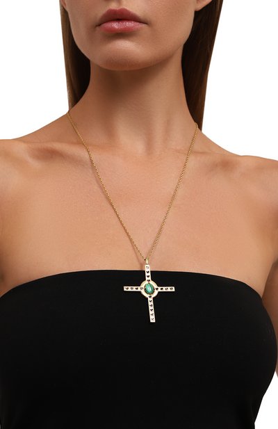 Крупную подвеску-крест AI и тонкую цепочку якорного плетения изготовили из серебра 925-й пробы с покрытием розовым золотом. Украшение дополнили кабошоном из сердолика и гранеными хризолитами.