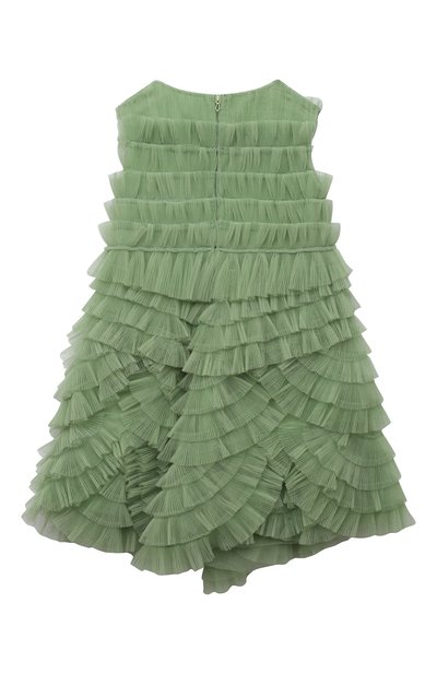 Кремовое платье справится с ролью наряда для особых случаев. Мастера бренда выполнили его из нежного тюля и дополнили многоярусными воланами. На сетчатом материале разноцветным шелком и фиолетовыми бусинами-пайетками сформировали изящные цветы. Долю графичности модели добавляют зеленые бархатные ленты, которыми подчеркнули детали кроя, — их оттенок повторили в отделке фестончатых оборок. На принадлежность изделия бренду, основанному Гуччио Гуччи, указали з олотистыми монограммами GG, которыми расшили воздушный текстиль.