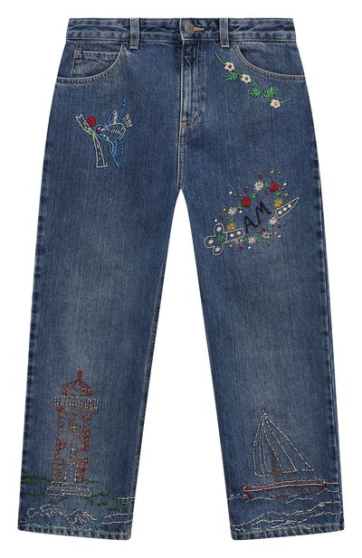 Синие джинсы с классической посадкой выполнены из гладкого хлопка с небольшими потертостями. Прочный материал хорошо пропускает воздух, а одежда из него не растягивается и надолго сохраняет заданную форму. Мастера марки вручную украсили модель разноцветной красочной вышивкой.