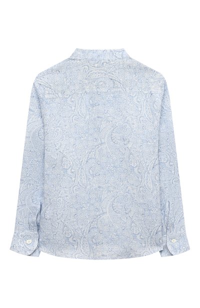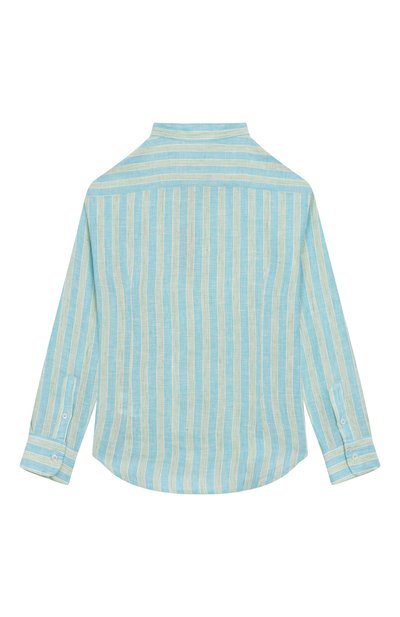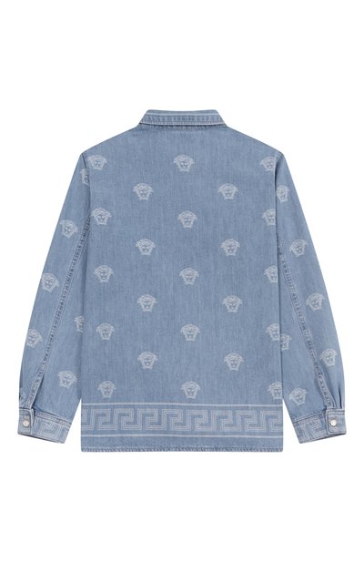 Для пошива голубой рубашки с воротником button down мастера марки использовали тонкий плотный хлопок, который не мешает циркуляции воздуха. Узкие верт икальные полосы на материале составили из повторяющегося миниатюрного логотипа бренда, выделив узор шелковистым блеском.