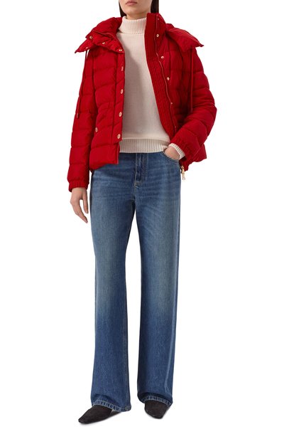 Для пошива короткой утепленной куртки со съемным капюшоном и ремешками велкро на манжетах использовали плотную нейлоновую ткань. Рукава модели с двумя парами накладных карманов можно отстегнуть, превратив изделие в жилет.