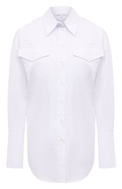 Для создания рубашки с двумя накладными карманами Патриция Бамби выбрала тонкую хлопковую ткань, в которую для прочности добавили нейлон и эластан. Принадлежность марке дизайнер обозначила максимально деликатно, расположив у края вышитый логотип. Наши стилисты предлагают сделать свободную модель частью повседневного образа, например, с джинсами, жакетом и пенни-лоферами.