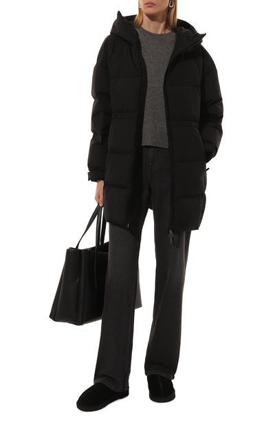 Длинный черный пуховик мастера марки сшили из плотного водоотталкивающего нейлона с добавлением эластана. Стеганые ячейки заполнили легким наполнителем из отборного пуха с добавлением пера, которые поддерживают комфортный микроклимат при температуре воздуха от -20 до -10 градусов. Дополнительную защиту от ветра обеспечивают глубокий капюшон и штормовая кнопочная планка, закрывающая молнию.