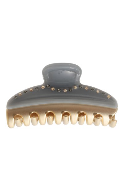 Серая заколка с упругой пружиной изготовлена мастерами марки вручную из глянцевого прочного ацетата. Аксессуар с закругленными золотистыми зубцами не повреждает волосы, надежно фиксирует пряди в прическе и почти не ощущается на голове. Изделие украшено сверкающими кристаллами.