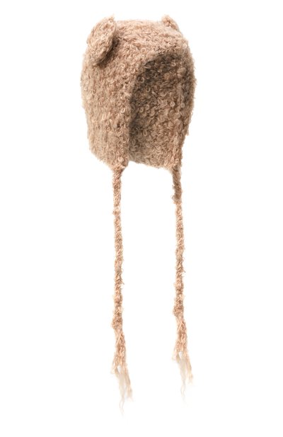 Бежевая шапка с накладками, имитирующими уши, и длинными завязками добавит образу детской наивности. Для изготовления аксессуара использовали мягкую буклированную пряжу из тонкой шерсти и пушистого мохера. Чтобы такая модель, хорошо удерживающая тепло, не вытянулась, материал укрепили нитями акрила.