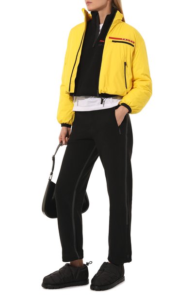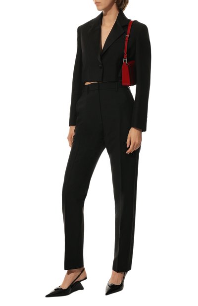 Черные брюки с завышенной посадкой и проглаженными стрелками — удачное вложение в базовый гардероб, которое с успехом дополнит как повседневный образ, так и формальный или нарядный комплекты. Для пошива модели Миучча Прада и Раф Симонс выбрали мягкий шерстяной габардин. Материал почти не мнется, поэтому изделие будет выглядеть безупречно в течение дня.