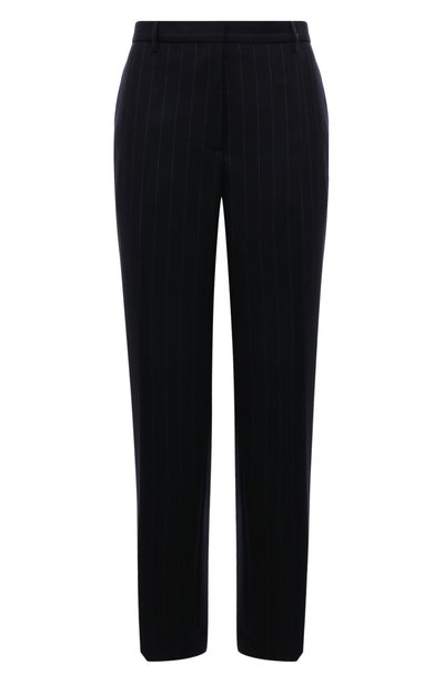 Для изготовления темно-синих брюк в тонкую вертикальную полоску Миучча Прада и Раф Симонс выбрали мягкий шерстяной габардин. Характерное плетение и свойства упругих шелковистых волокон делают материал прочным и немнущимся, поэтому модель с завышенной посадкой будет выглядеть безупречно в течение дня.
