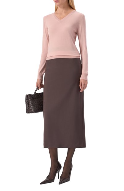 Розовый пуловер в исполнении Миуччи Прада и Рафа Симонса получился одновременно теплым и почти невесомым. Стать такой комфортной модели помог отборный мягкий кашемир с тонкими волокнами. Материал сохраняет оптимальную для тела температуру как на улице, так и в помещении, а прочнее его сделали волокна гладкого шелка, добавленные в состав пряжи.