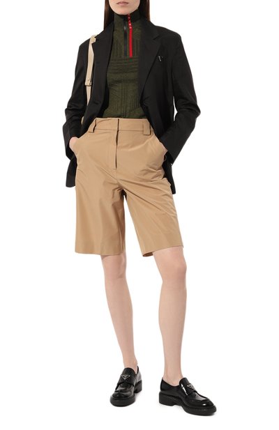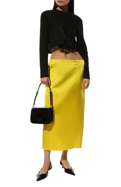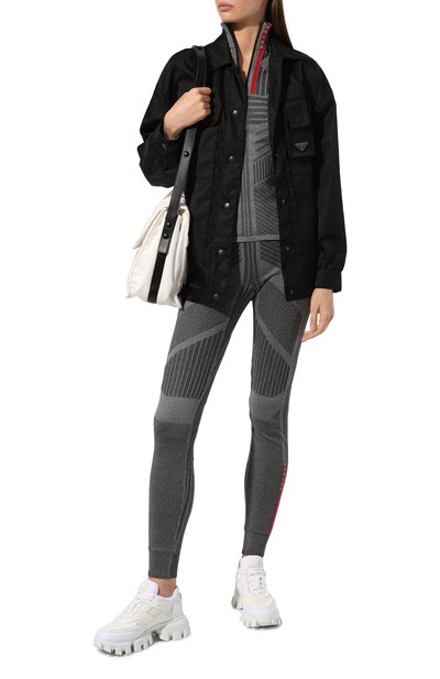 Для изготовления черного топа, стилизованного под джемпер с высоким воротом, мастера марки использовали тонкий эластичный трикотаж Tech Rec Nylon. Материал из переработанного полиэстера и прочной лайкры отталкивает влагу и легко тянется во все стороны, обеспечивая абсолютную свободу движений. Изделие с жаккардовым узором, визуально моделирующим силуэт, дополнили короткой герметичной молнией, вдоль которой расположили фирменную алую ленту с логотипом.