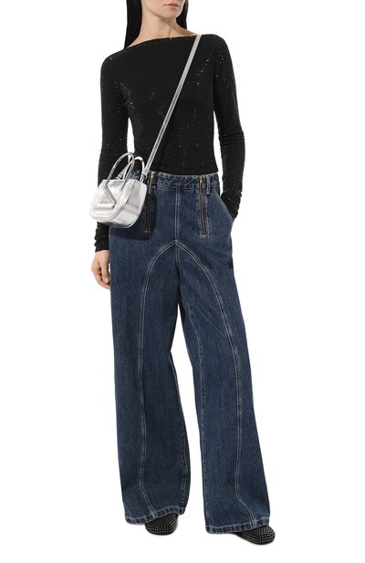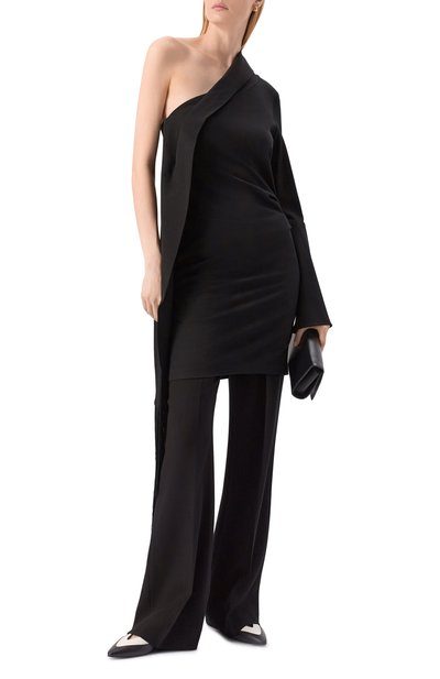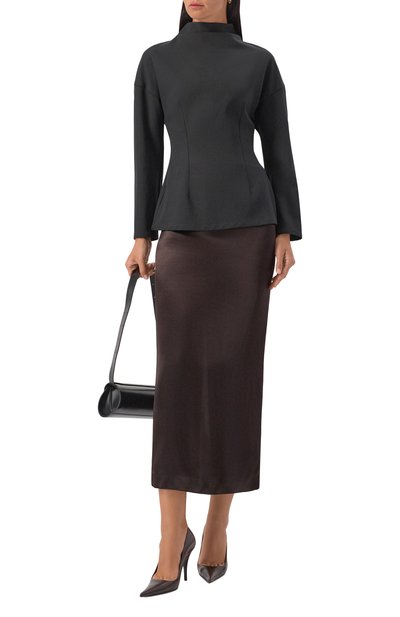 Для изготовления черного топа, стилизованного под джемпер с высоким воротом, мастера марки использовали тонкий элас тичный трикотаж Tech Rec Nylon. Материал из переработанного полиэстера и прочной лайкры отталкивает влагу и легко тянется во все стороны, обеспечивая абсолютную свободу движений. Изделие с жаккардовым узором, визуально моделирующим силуэт, дополнили короткой герметичной молнией, вдоль которой расположили фирменную алую ленту с логотипом.