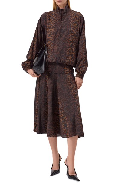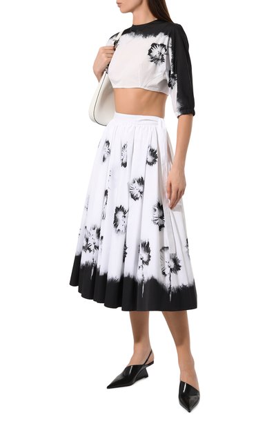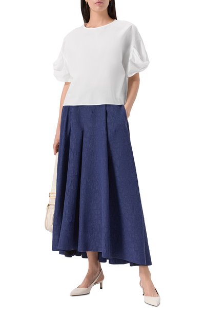 Синяя юбка в исполнении Миуччи Прады и Рафа Симонса автоматически сделает образ женственнее. Нужный тон модели задает расклешенный крой и крупный цветочный мотив, нанесенный в технике тай-дай, которая не предполагает существования двух одинаковых вещей. Изделие из шелковистого хлопкового поплина дополнили на поясе длинными лентами, завязывающимися на бант сбоку.