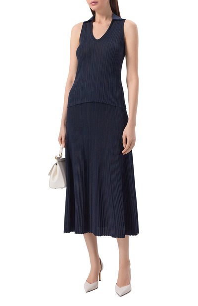 Для пошива плиссированной юбки длины миди Миучча Прада выбрала темно-синий твил на основе полиэстера, который хорошо держит форму и практически не мнется. Элегантная модель без подкладки застегивается молнией. О принадлежности бренду говорит контрастный жаккардовый логотип, которым декорировали эластичный пояс.