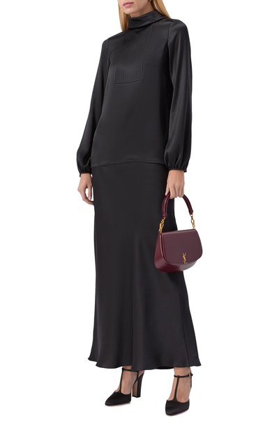 При создании черной миди-юбки Миучча Прада и Раф Симонс не использовали декор и дополнительные цветовые акценты, перенеся фокус внимания на лаконичный крой, напоминающий трапецию. Силуэт сделали чуть объемнее, украсив изделие сзади складками. Для пошива модели с боковой молнией дизайнеры выбрали тонкий, при этом плотный нейлон с шелковистым блеском.