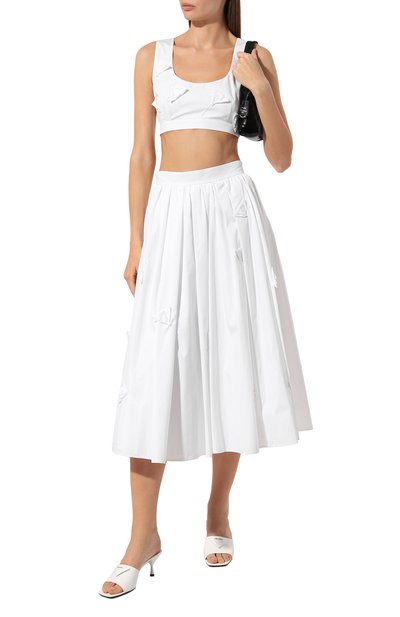 Белоснежный кроп-топ с X-образной спинкой мастера марки выполнили из легкого эластичного трикотажа на основе переработанного полиэстера. Изделие из такого материала хорошо тянется во все стороны, обеспечивая комфортную плотную посадку и полную свободу движений. Сбоку модель украсили фирменной алой лентой с логотипом.