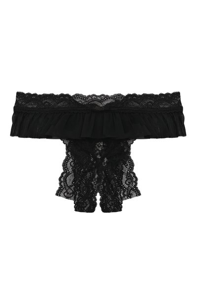 Мастера марки выполнили черные трусы из тонкого ажурного кружева с растительным мотивом. Концы фестончатого пояса модели, украшенного воланом из полупрозрачного тюля, сзади можно завязать в объемный бант. Изделие с плоскими швами приятно ощущается на коже, не вызывая раздражения.