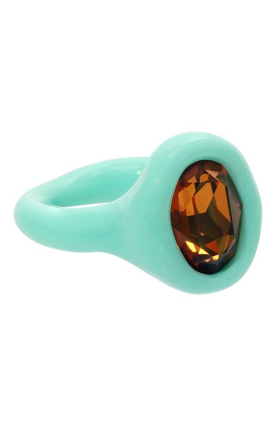 Бирюзовое кольцо выполнили из полимерной глины. Объемную форму аксессуару придали вручную и стабилизировали ее при высоких температурах, а затем покрыли тонким слоем прозрачного лака, создающим деликатный глянцевый блеск. Его поддержали золотистым мерцанием овального кристалла Swarovski.