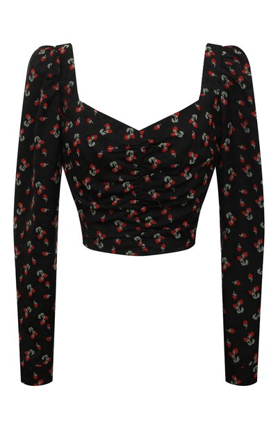 Укороченный черный топ с мелким орнаментом в виде красных ягод добавит романтики комплекту, составленному в темной палитре. Для пошива модели с глубоким фигурным декольте и небольшой драпировкой спереди, добавляющей визуальный объем груди, использовали мягкий шелковый жаккард. Изделие с акцентированными плечами, длинными рукавами и открытой спиной застегивается на молнию сзади.