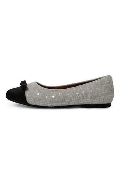 Балетки на устойчивом квадратном каблуке станут ярким акцентом в образе благодаря мерцающему глиттеру, покрывающему тонкий текстиль. Края выреза укрепили лентой грогрен, а союзку украсили небольшим бантом.