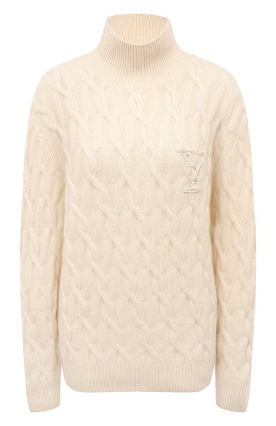 Мастера бренда связали кремовый свитер из фактурной шерсти, которая сочетает в себе тепло и мягкость. Пряжу переплели в арановый узор, придающий свободному изделию объем. Изделие декорировали крупным патчем в виде литеры Y, расшитым пайетками, жемчужинами и бисером.