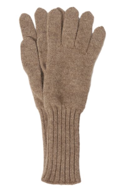 Мастера марки выполнили бежевые перчатки из нежного кашемира. Пух высокогорных коз для изготовления такого материала вычесывают и обрабатывают вручную, чтобы в нити не попали грубые волокна верхней шерсти. Для большего тепла аксессуар дополнили удлиненной облегающей манжето й.