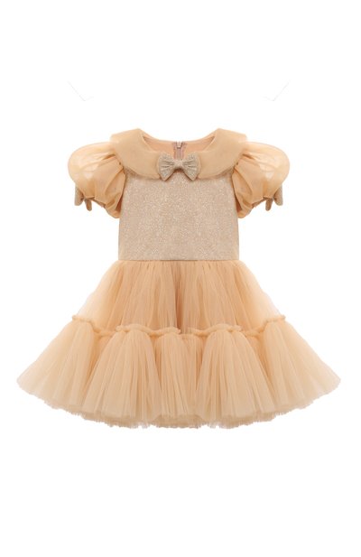 Бежевое платье – идеальный выбор для праздника. Для пошива приталенной модели использовали плотный фактурный текстиль с серебристым люрексом и полупрозрачный легкий тюль. Из этого материала выполнили пышный многослойный подол с широкой оборкой, объемные драпированные короткие рукава и отложной воротник, украшенный аппликацией в виде банта.