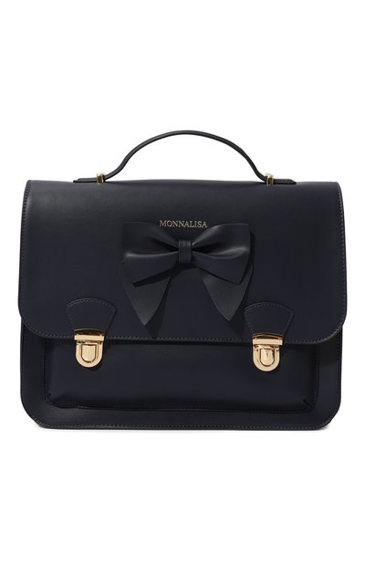 В темно-синем портфеле с одним основным отсеком и дополнительным накладным карманом тетради не помнутся. Аксессуар выполнили из прочной мелкозернистой кожи. Такой же материал использовали для изготовления крупного банта, которым украсили клапан с тисненым логотипом бренда.