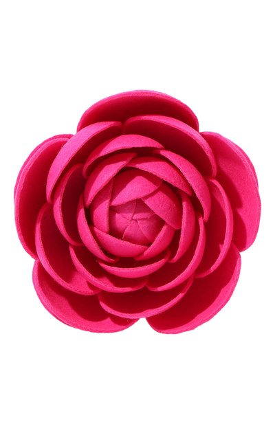 При создании крупной броши в виде камелии дизайнеры марки с высокой точностью процитировали настоящий цветок. Плавность линий лепестков подчеркнули активным оттенком фуксии. Объемный бутон выполнили из плотного текстиля, который обработали специальным составом, поэтому аксессуар безупречно держит заданную форму.