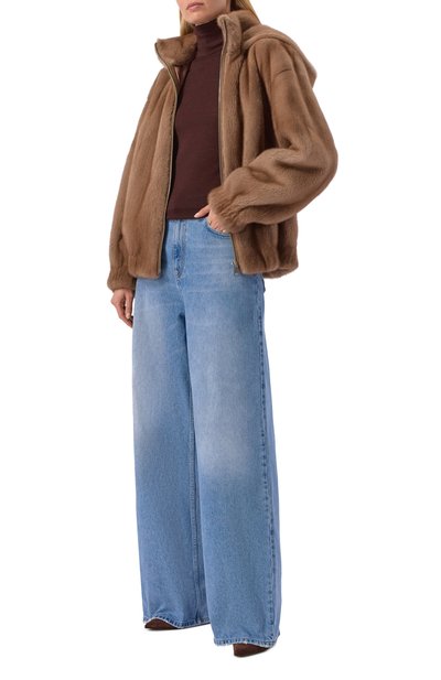 Бежевую двубортную шубу с шалевым воротником и врезными карманами сшили из пластичного меха норки с густым шелковистым ворсом. Чтобы создать эффект цельного полотна, пушнину тщательно подобрали по длине и оттенку ворса, а отрезы искусно соединили вручную практически незаметными швами.