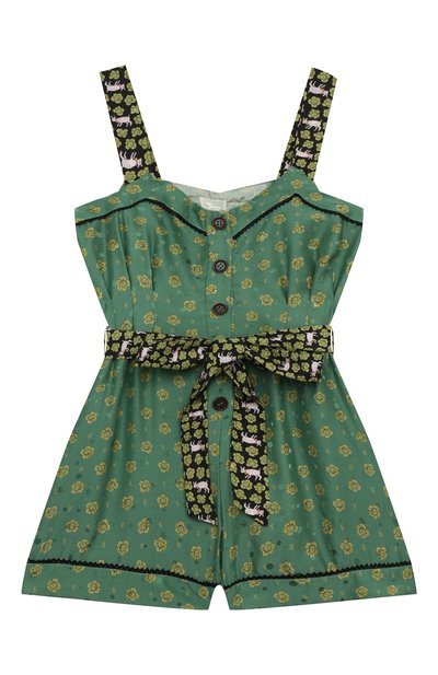 Для пошива комбинезона с пуговицами по всей длине спереди использовали легкий нежный шелк зеленого и черного оттенков, связующим звеном для которых стали авторские мотивы. Кант вдоль фигурного выреза и отвороты на шортах подчеркнули узкими кружевными лентами. Изделие с широкими регулируемыми бретелями дополнили длинным поясом, завязывающимся на бант.