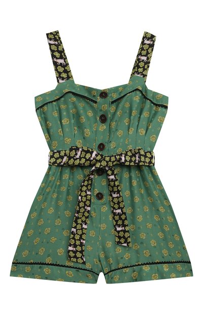 Мастера марки сшили зеленый комбинезон из легкого шелкового жоржета с цветочным мотивом. Прочный материал мало мнется и не вытягивается после стирок, поэтому модель с вытачками на талии надолго сохранит безупречный внешний вид. Такую же ткань, но черного цвета, использовали для широких регулируемых бретелей и пояса.