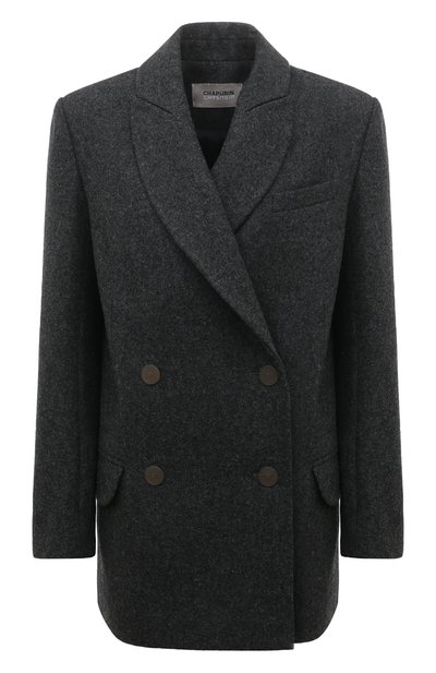 Темно-серый двубортный жакет с акцентированной линией плеч — идеальный выбор для офиса, а для города его адаптирует полупрозрачный тонкий топ. Для изготовления модели с фигурными широкими лацканами и шлицей сзади Игорь Чапурин использовал мягкую ворсистую шерсть. Легкий материал хорошо пропускает воздух, поддерживая комфортную температуру как в помещении, так и на улице.