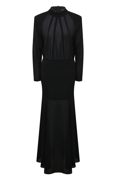 Приталенное макси-платье с длинными рукавами и воротником-стойкой сшито из полупрозрачной шелковой вуали, образующей мягкие складки. Легкая модель с матовой баской застегивается сзади потайной молнией. Наши стилисты предлагают создать образ total black с босоножками и сумкой в тон.