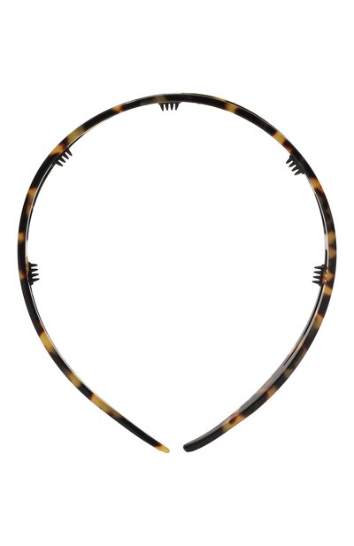 Тонкий двойной ободок черепаховой расцветки украсит прическу, не выходя за рамки делового дресс-кода. Аксессуар выполнили из легкого полупрозрачного ацетата, поэтому он не давит на виски и не электризует волосы. Зубчики на внутренней поверхности надежно фиксируют модель и не позволяют ей соскальзывать. На принадлежность бренду указывает миниатюрная эмблема из золотистого металла.