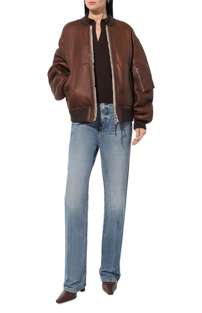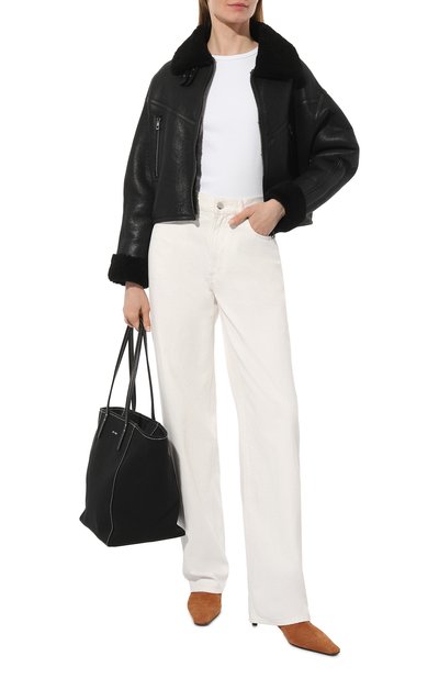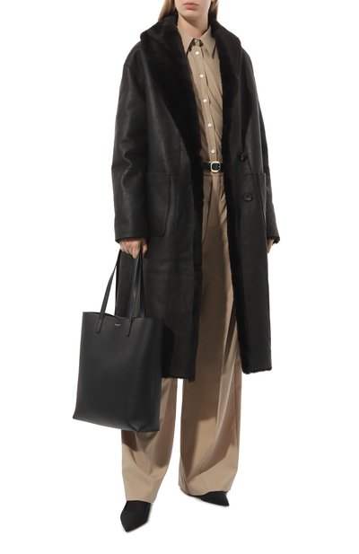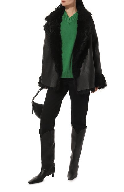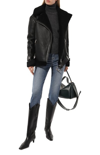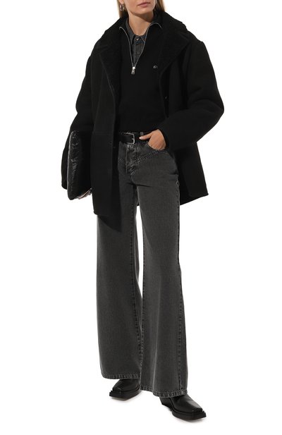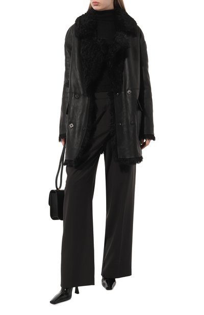 На создание черной дубленки дизайнеров бренда вдохновила традиционная куртка пилота. На это указывают отложной воротник, подчеркнутые погонами плечи, широкий пояс с акцентной металлической фурнитурой в тон крупной молнии. Модель сшили из мягкой овчины, бархатистой снаружи и пушистой с изнанки. Приятный на ощупь материал надежно удерживает тепло и защищает от ветра.