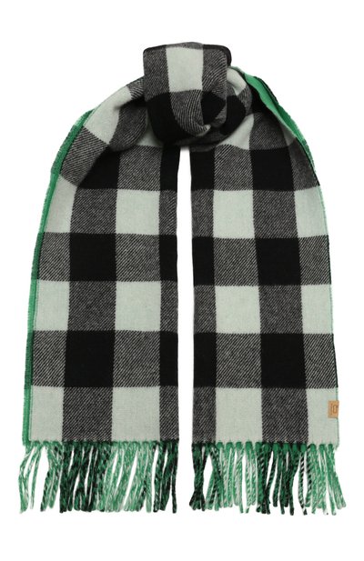 Зеленый шарф из плотной, приятной на ощупь шерсти хорошо сохраняет тепло и не колется: материал изготовили из особенно мягкого сырья, полученного после первого пострига животных. Лицевой стороне с крупным клетчатым узором противопоставили однотонную изнанку. Края аксессуара, длины которого хватит, чтобы несколько раз обернуть вокруг шеи, подчеркнули бахромой.