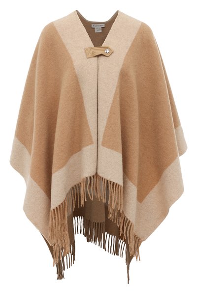 Свободная бежевая накидка с длинной бахромой по краям, напоминающая пончо, добавит уют повседневному образу. Для изготовления модели использовали тонкую нежную шерсть, которая хорошо удерживает тепло, а чтобы она дольше сохраняла безупречный вид, в состав материала включили прочные волокна полиамида. Изделие дополнили спереди нейлоновым стеганым ремешком с кнопкой, поэтому оно не будет соскальзывать с плеч.