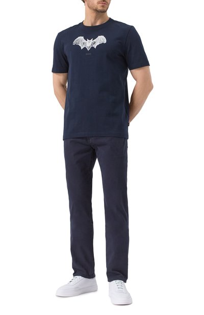Мягкое хлопковое джерси, поддерживающее оптимальный микроклимат, и прямой крой, не сковывающий движения, делают синюю футболку максимально комфортной. Модель украсили желтыми потертыми фирменными принтами спереди и сзади, сформировав иллюзию вещи, которую носили не один сезон.