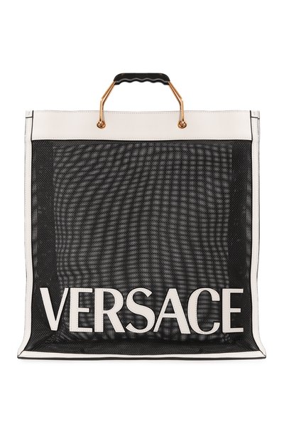 Сумку из матовой телячьей кожи и полупрозрачной сетки дополнили двумя короткими ручками из металла и пластика. Вместительный аксессуар украсили крупной аппликацией-логотипом спереди.
