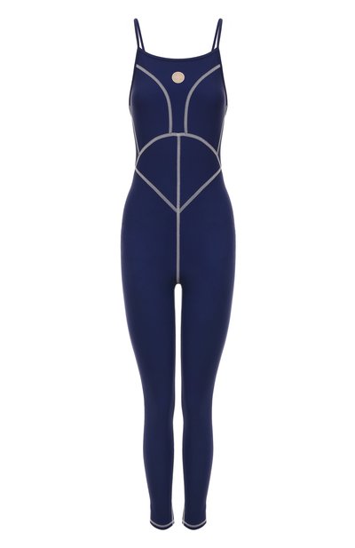 Широкие белые швы подчеркивают выверенный крой спортивного комбинезона без застежки и формируют графичный рисунок. Сзади его продолжают узкие бретели на почти открытой спине, соединенные небольшой деталью с эмблемой марки. И фирменная символика, и акцентный орнамент контрастируют с синим полиамидом стрейч, который комфортно облегает тело и дает небольшую дополнительную поддержку мышцам во время тренировки.
